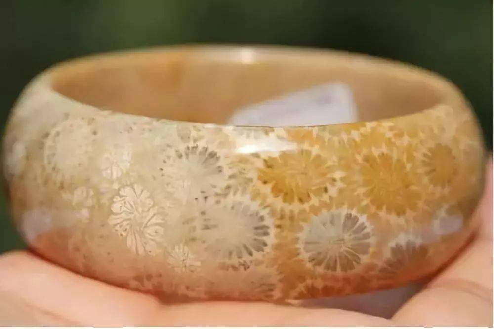 珊瑚玉化石又名菊花玉,是经历数亿年的地壳运动、地热煎熬、高温高压才能形成的化石玉,被誉为“有机宝石”。